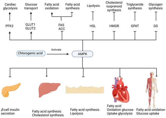 Furthermore, Bakuradze et al. [] suggested that consumption of three to four cups of coffee per day could reduce oxidative damage, body fat mass, and energy/nutrient intake and that these effects were partially attributed to CGAs. Shearer et al. [] studied the effects of regular and decaffeinated coffee (with CGAs) consumption for 28 days on insulin functions, in vivo using a rat model. They observed that the ingestion of decaffeinated coffee improves insulin-stimulated disposal in the high-fat-fed and insulin-resistant rats. Other suggested mechanisms of CGAs are related to the improvement of glucose and lipid metabolism by activating of AMP activated protein kinase (AMPK) [], as shown in Figure 3. AMPK is a master sensor and regulator of cellular energy balance. This enzyme is activated by diverse pathological, metabolic, and pharmacological stressors such as hypoxia, exercise, thiazolidinediones, and metformin. This activation provokes the translocation of glucose transporter type 4 (GLUT4) from intracellular membranes to plasma and, therefore, the increase of glucose transport [,,].