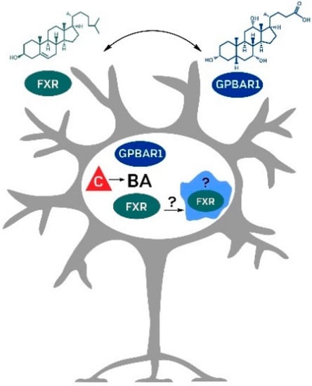 Possible primary signaling pathways (GPBAR1 and FXR) and the potential role of endogenous bile acids in models of neurodegenerative disorders. BA—bile acids, C—cholesterol, FXR—farnesoid X receptor, GPBAR1—G protein-coupled bile acid receptor 1.