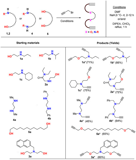 Synthesis of alkyne precursors (amine-hydroxyl derivatives) with N-O combination without amide (1a–1c), N-O combination with amide functional group (2a), and O-N-O combination (3a).
