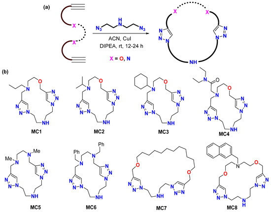 Aza-oxa-based macrocyclic systems are well known from crown ethers, the first synthetic macrocycles. All oxygen crown ethers and all nitrogen crown ethers showed different properties as receptors for molecular recognition processes [24]. The number of these heteroatoms in the cyclic backbone also impacts their binding properties. Undoubtedly, a modular platform with different types and a variable number of heteroatoms in the macrocyclic system can show diverse effects in the binding properties for various material and biomedical applications. Triazoles, five-membered nitrogen-containing heterocycles, are strategically incorporated into the macrocyclic scaffold by the copper-catalyzed azide-alkyne cycloaddition (CuAAC) reaction to enhance its versatility for biomedical applications. Interestingly, triazoles can form various non-covalent interactions, such as Van der Waals forces, hydrogen bonding, dipole–dipole, and hydrophobic interactions, with various biological targets with a high affinity. In this regard, these motifs are considered to be critical units for synthesizing various biologically active constructs, as they can also enhance water solubility. Macrocycles comprising triazole cores are worthwhile scaffolds in various fields, particularly in materials, pharmaceutical, medicinal, and supramolecular chemistry [25,26,27]. They can act as chemosensors, molecular receptors, peptidomimetics, drug carriers, and enzyme inhibitors and show exciting features, such as self-assembling and anion-binding properties [28,29,30,31,32]. These are derived from azide- and alkyne-based fragments via click fashion (CuAAC) by inter- and intramolecular cyclization. The CuAAC reaction mainly depends on the conformation of a substrate, solvent, and type of linker between azide and alkyne and its concentration.