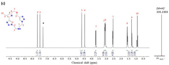 Bis-alkynes were synthesized by the N-propargylation and/or O-propargylation of diamines, diols, and amine-hydroxyl derivatives, (1a*–1c*, 2a*, 3a*, 4a*, 4b*, and 5a*, Figure 1). N-propargylation was carried out by the reaction of the amine with propargyl bromide in the presence of a strong base, sodium hydride, in DMF. O-propargylation was carried out using NaH as the base for the reaction of diols of various chain lengths with propargyl bromide. This reaction was completed within 2–12 h, while the N-propargylation reaction took 1–2 h for completion in the presence of N,N-Diisopropylethylamine (DIPEA) as the base. The products were purified by column chromatography, and a moderate to good yield was obtained for all the bis-alkyne products (Figure 1). The characterizations of all the bis-alkynes were carried by 1H NMR and are given in Figures S7, S9, S11, S13, S15, S17, S19 and S21. Bis-azides are also equally crucial in click reactions; thus, it was synthesized from diethanolamine by reacting with thionyl chloride followed by sodium azide (Scheme S1, Figure S1). The azide used for all the macrocyclization was the same, and it possessed a free secondary amine. The addition of any functional group is conceivable with this amine, and it could also be exploited for post-synthetic modifications based on the requirements.