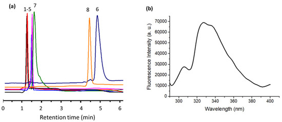 Properties of the macrocycles. (a). Reverse-phase high-performance liquid chromatography (RP-HPLC) traces of MC1–8. (Acetonitrile and water with 0.1% formic acid were used as the eluting solvent. The compounds were eluted over 15 min in 5–95 % acetonitrile in water.); (b). Fluorescence spectrum of 10 μM MC8 in methanol upon excitation with a wavelength of 278 nm.