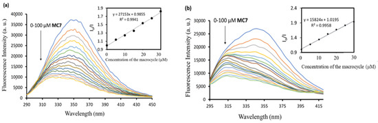 Fluorescence quenching of protein by MC7 at excitation wavelength 280 nm, (a) BSA and (b) HSA. To 10 µM protein solution in phosphate buffer (pH 7.4), 2–100 µM macrocycle solution was added at 25 °C. Inset: Stern–Volmer Plot; Io and I are the fluorescence intensity at 0 µM and the given concentration of the macrocycle, and the slope is considered as the binding constant.