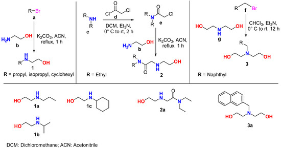 The amine-hydroxyl derivatives, which are the bis-alkyne precursors for N-O combinations, are of two types: (i) without an amide functional group (1, Scheme 1) and (ii) with a pendant amide functional group (2, Scheme 1). The first one was synthesized via the reaction of various alkyl bromides (a, Scheme 1) with ethanolamine (b, Scheme 1) in the presence of a base in a reflux condition in acetonitrile (ACN) as the solvent. The formed product (1, Scheme 1) proceeded to the next step after solvent extraction. The amine-hydroxyl derivative with the pendant amide functional group was synthesized by a two-step reaction as per the reported procedure [34]. The first step was the alkyl amine reaction with chloroacetyl chloride (d, Scheme 1) in the presence of triethylamine (TEA) as the base and dichloromethane (DCM) as the solvent to obtain e, Scheme 1. This reaction was followed by the ethanolamine reaction in ACN, and the product (2, Scheme 1) was taken over to the next step. The precursor for the O-N-O combination was synthesized by a reaction of 2-(bromomethyl) naphthalene f, Scheme 1) with diethanolamine (g, Scheme 1) in the presence of TEA. Thus, a naphthyl derivative of diethanolamine (3, Scheme 1) was obtained with a high purity. N, N′-substituted diamines and diols were the other precursors used for bis-alkynes.