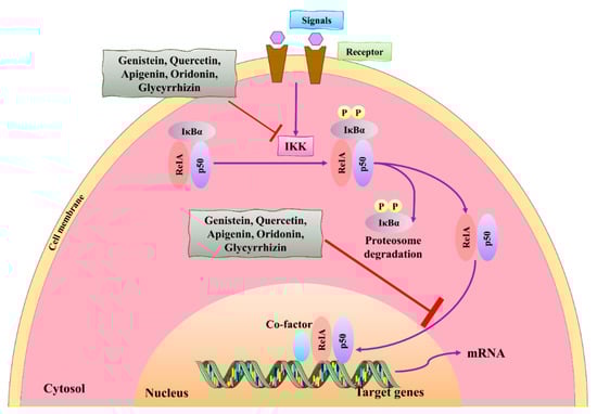 | Genistein | ![]() | Isoflavones | Soy-based foods | In vitro | ER-positive, TNBC | --- | Activation of NF-κB showed potential against MCF-7 at an IC50 value of 20 µM. | It inhibits the phosphorylation of IκBα in MCF-7/T47D/MDA-MB-231 cell lines, thus playing a significant role in the regulation of IκBα to the p50. | [73] |