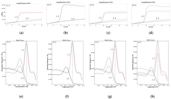Amplification plot and melt curve of the LMTIA reaction at different temperatures. (a): the amplification plot of the LMTIA reaction at 51 °C; (b): the amplification plot of the LMTIA reaction at 52 °C; (c) the amplification plot of the LMTIA reaction at 53 °C; (d): the amplification plot of the LMTIA reaction at 54 °C; (e): the melt curve of the LMTIA reaction at 51 °C; (f): the melt curve of the LMTIA reaction at 52 °C; (g): the melt curve of the LMTIA reaction at 53 °C; (h): the melt curve of the LMTIA reaction at 54 °C. 1, 2: cassava (M. esculenta) DNA; 3, 4: ddH2O.