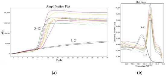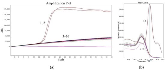 Specificity of the LMTIA assay with different DNA types. (a): the amplification plot of the LMTIA assay; (b): the melt curve of the LMTIA assay. 1, 2: cassava DNA; 3, 4: ddH2O; 5–16: the DNAs of I. batatas, S. tuberosum, Z. mays, V. radiata, T. aestivum, and G. max.