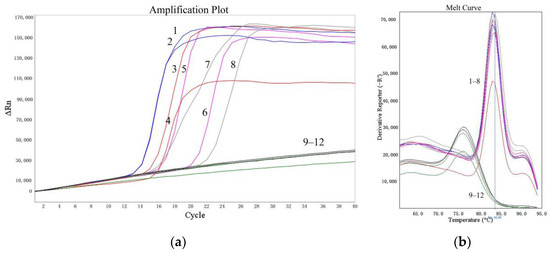 Suitability of the LMTIA assay for distinguishing the DNA extracted from sweet potato starch mixed with cassava starch. (a): the amplification plot of the LMTIA assay; (b): the melt curve of the LMTIA assay. 1, 2: ddH2O; 3, 4: 1 ng cassava DNA; 5–12: the DNA extracted from sweet potato starch adulterated with cassava starch at 5%, 1%, 0.1%, and 0.01% (w/w).
