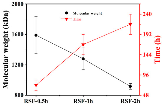 Molecular weights and gelation times of silk fibroin under different degumming times. The silk fibroin extracted under the degumming times of 0.5, 1, and 2 h were named RSF-0.5h, RSF-1h, and RSF-2h, respectively.