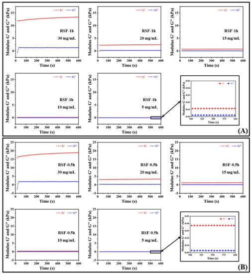 Figure 3B shows the changes in the storage modulus, G′, and loss modulus, G″, of silk fibroin hydrogel RSF-0.5h at five concentrations within 600 s. The rheological properties of RSF-0.5h with the change in the concentration of silk fibroin aqueous solution was consistent with that of RSF-1h; that is, the greater the concentration of silk fibroin aqueous solution, the greater the storage modulus of the hydrogel formed by it, and the storage modulus reflected the elastic capacity, indicating that the high-concentration silk fibroin hydrogel had a higher mechanical strength [28]. The storage modulus of the hydrogel formed by 30 mg/mL silk fibroin aqueous solution reached 19.0 kPa. In addition, comparing the rheological properties of RSF-0.5h and RSF-1h, it was found that the silk fibroin with a larger molecular weight had a higher mechanical strength after forming a hydrogel at the same concentration.