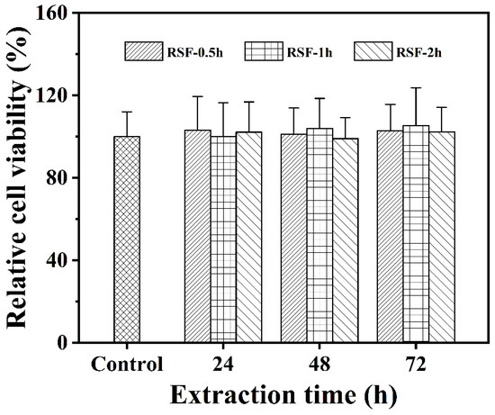 In this work, an experimental group and a blank control group were set up. The experimental group contained the 24, 48, and 72 h leaching solutions of silk fibroin hydrogels (RSF-0.5h, RSF-1h, and RSF-2h), and the leaching solutions were diluted 10 times. The blank control group was the medium containing 10% fetal bovine serum and 1% double antibody (100 U/mL penicillin and 100 μg/mL streptomycin). The experimental group and blank control group were added to the 96-well plate inoculated with cells, and six parallel samples were set in each group. Finally, the 96-well plate was co-cultured in a cell incubator at 37 °C and 5% CO2 for 48 h.
