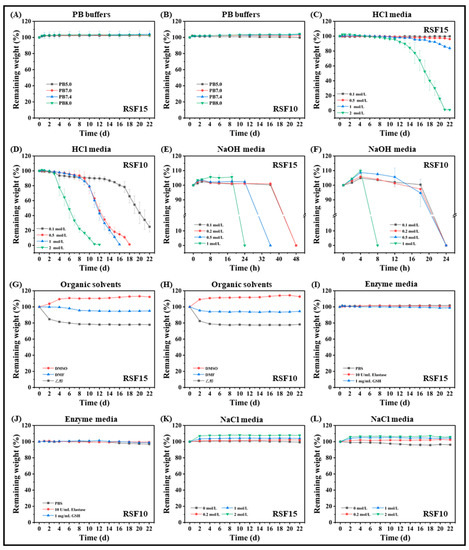 The degradation behavior of two concentrations of silk fibroin hydrogels (RSF15 and RSF10) in different media (phosphate buffers with different pH values, hydrochloric acid, and sodium hydroxide solutions with different concentrations, organic solvents, protease solutions, and NaCl solutions with different concentrations) were explored.