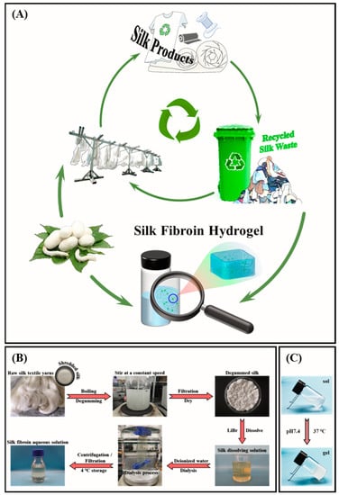 With the development of science and technology, problems related to resources and the environment have become prominent. In the process of the industrial production of silk fabrics, tons of damaged or difficult-to-handle silkworm cocoons are discarded as waste every year due to their substandard quality [1]. In addition, waste textile products in daily life are everywhere and are increasing day by day. This has caused great wastage of resources and, to a certain extent, serious environmental problems [2,3]. The use of silk dates back thousands of years. It is rich in output, has excellent mechanical properties, and is known as the “Queen of Fiber” for its luster color sense and soft, delicate feel. It has been widely used in textiles and clothing [3,4,5]. With the gradual development and application of the efficacy of fibroin in silk, silk has been favored in biomedicine as a valuable natural protein fiber raw material [6]. Like natural silk fibers, the main components of cocoon waste and waste fabrics are silk fibroin and sericin, which can be used as raw materials for the development of silk-based products [7]. Therefore, recycled silk waste still has a considerable recycling value left to be explored and broad application prospects in the field of medical hydrogels (Scheme 1A). The benefits are significant in terms of alleviating the storage pressure of waste silk and reducing the cost of silk products.