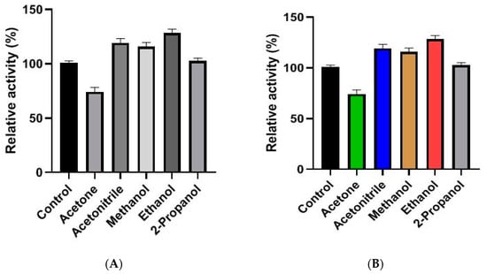 The purified PLA2 displayed better functional stability in the presence of polar solvents after an incubation time of 2 h, compared to the control test (Figure 4). It reaches 105% of its activity in presence of acetonitrile, 100% in the presence of methanol and 2-propanol and 124% in the presence of ethanol. In fact, it has been proved that organic solvents are advantageous in various industrial enzymatic processes since their use can increase the solubility of non-polar substrates, the thermal stability of enzymes, or eliminate microbial contamination [34].