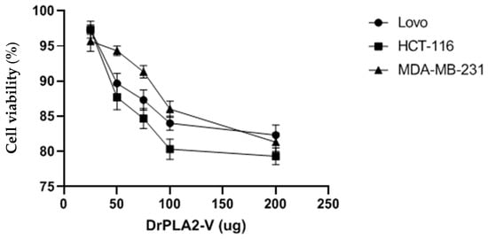 Cytotoxic potency of DrPL2 -V on Lovo, HCT-116, and MDA-MB-231 cells. Cytotoxicity was assessed using the MTT assay by incubating cells for 24 h with various concentrations (25, 50, 100, and 200 μg) of DrPLA2-V.
