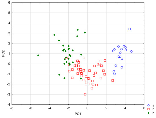 The PC1 factor discriminates the groups of APIs the most (PC 1 eigenvalue = 3.61). The variables PhCharge and pKa have the most important share in its value. The PC2 factor (PC2 eigenvalue = 0.81) was shaped by the chromatographic descriptors and the ability to ionize (log U/D). The means of the canonical variables (PC1) for group a = −3.52, for group n = 0.03 and for group b = 2.08, therefore PC1 most strongly discriminates between groups a and b. The means of the canonical variables (PC2) for group a = −0.93, for group n = 0.86 and for group b = −0.97. In this case, the centroids of groups a and b are almost equal, and the group of neutral compounds (n) is the most discriminated against (Figure 1).
