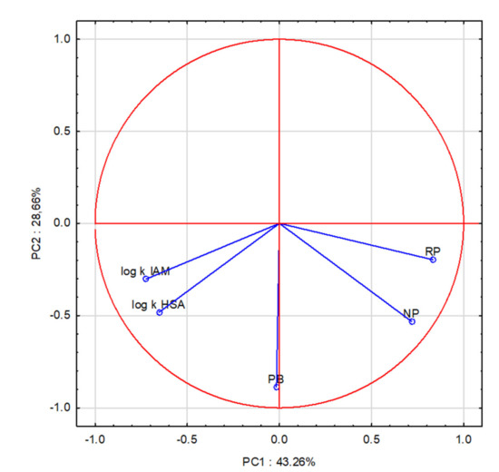In the course of the analysis, the smallest number of principal components explaining the maximum range of the total variance in the group was initially established. Five factors explain 100% of the variability in the levels of drug excretion into breast milk. The first two factors, PC1 and PC2 (principal components), are described by all used descriptors. As a result, two main components explaining a total of 72% of the variability were obtained. The HPLCHSA, HPLCIAM, NP TLC and RP TLC chromatographic data is responsible for the first component, PC1 (43.26%), the second component, PC2 (28.66%), is determined by the PB value.
