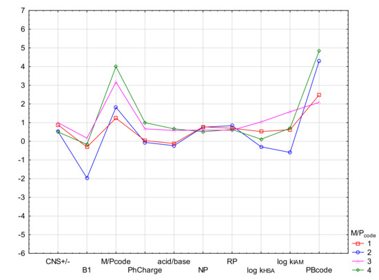 In order to emphasize the diagnostic value of the experiment and to determine the difference in the values of the parameters determining the ability of drugs to penetrate into breast milk, cluster analysis (CA) was also performed. CA was conducted in the proposed M/Pcode scale, using the k-means method. The means of the most important biological descriptors (CNS +/−, B1, PhCharge, acid/base, NP, RP, log kHSA, log kIAM and PBcode) were compared for groups M/Pcode 1–4. As shown, all drug biological parameters showed a group variability (see Figure 4). The M/P code values range from 1 to 4 with a clear distinction between relatively safe and unsafe groups. Physicochemical parameters: PB, acid/base, HD, log P, eL, log D also show differentiation, but not in all cases. Unfortunately, M/Pcode is too clustered here, which indicates a smaller influence of the tested properties on the observed feature (Figure 5). The descriptors: log D and eL show the highest differentiation.