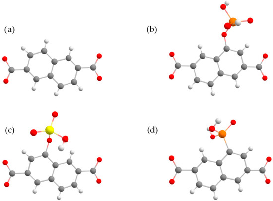 Figure 1. The functionalized linker of IRMOF-8 considered in the GCMC simulations; the original IRMOF-8 linker (a), the -OPO3H2 (b), -OSO3H (c), and -PO3H2 (d) functionalized linker. Carbon, hydrogen, oxygen, sulfur, and phosphorus atoms are depicted as gray, white, red, yellow, and orange spheres, respectively.
