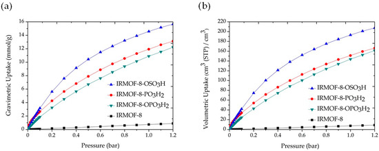 Figure 4. Gravimetric (a) and volumetric (b) NO2 uptake isotherms for IRMOF-8 and IRMOF-8-X (X: -OSO3H, -PO3H2, -OPO3H2) at 298 K.