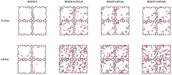 Figure 5. Snapshots for the IRMOF-8, IRMOF-8-X (X: -OSO3H, -PO3H2, -OPO3H2) from the GCMC at 298 K-0.1 bar and 298 K-1.0 bar.