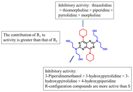 Herein, we summarize the structure–activity relationship (see Figure 2). The first round of modifications concentrated on 4,8-positions of pyrimidopyrimidine core (R1 groups). Compounds 4b and 4g with lipophilic tetrahydrothiazole and thiomorpholine rings showed the best inhibitory activity with IC50 of 64 nM and 113 nM, respectively. But compound 4e with smaller tetrahydropyrrole rings showed less than 50% inhibition at 500 nM. Compounds 4c and 4d containing fluorine-substituted piperidine rings exhibited a slightly decreased activity compared to DIP, with IC50 of 343 and 362 nM, respectively. In contrast, compounds 4h–i containing fluorine-substituted tetrahydropyrrole rings exhibited increased activity compared to 4e. The inhibitory activity of compound (S)-4h was slightly better than (R)-4h. Morpholine-substituted compound 4a exhibited decreased activity compared to DIP (IC50 > 500 nM), suggesting that hydrophobic groups with certain volume at 4,8-positions of pyrimidopyrimidine core are advantageous to PDE5 inhibition.