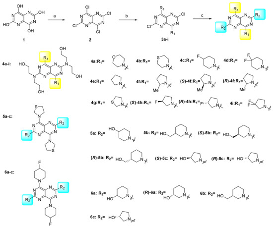 Reagents and conditions: (a) POCl3, PCl5, 120 °C; (b) THF, room temperature, 30 min; (c) DEA, 150 °C, overnight (4a–i); amine, 100 °C, overnight (5a–c, 6a–c).