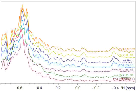The aliphatic 1H NMR spectrum of the reference PD-L1 (blue) superimposed on the spectrum of the PD-L1 titrated with compounds 4 (green—protein–ligand molar ratio, 1:1), 5 (light blue—protein–ligand molar ratio, 1:1; purple—protein–ligand molar ratio, 1:5), 6 (yellow—protein–ligand molar ratio, 1:1; orange—protein–ligand molar ratio, 1:10), and the spectrum of PD-L1 titrated with a known PD-L1 inhibitor—BMS-1166 (red, protein–ligand molar ratio, 1:1).