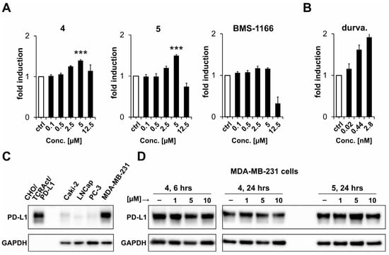 Bioactivity of the indicated compounds. (A,B) The activity was monitored with a cell-based immune checkpoint blockade (ICB) assay. Jurkat ECs were contacted with pre-seeded CHO/TCRAct/PD-L1 cells in the presence of the indicated concentrations of the compounds (A) or durvalumab (B) as a positive control. The cells were co-cultured for 6 h and the luminescence signal was measured following the addition of the Bio-Glo substrate. The graphs show fold induction calculated versus either DMSO-treated (for small molecules) or untreated (for durvalumab) control (ctrl) cells. The results are mean ± SD from three independent experiments. For statistical analysis, Student’s t-test was performed: ***, p < 0.001 vs. BMS-1166 treated cells. (C) Analysis of the expression of PD-L1 in four human cancer cell lines compared to PD-L1-overexpressing CHO/TCRAct/PD-L1 cells. (D) Analysis of the expression of PD-L1 in MDA-MB-231 cells treated with either 4 or 5 compounds for 6 or 24 h.