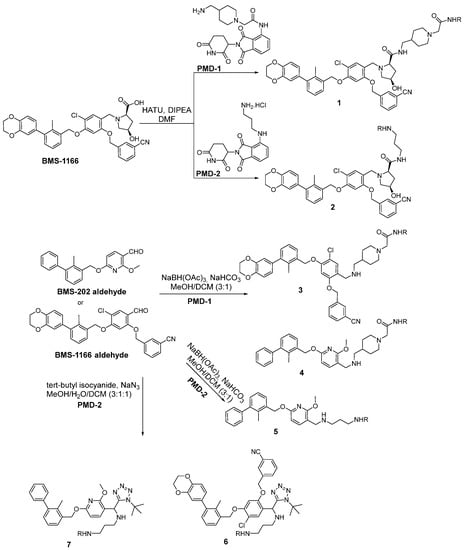 Biphenyl BMS-based chimeras were obtained either from a full-length carboxylic acid BMS-1166 by the HATU coupling with amine-derived pomalidomide (for compounds 1 and 2) or from the corresponding BMS aldehydes via reductive amination (compounds 3–5) and the Ugi tetrazole reaction (compounds 6 and 7) with the same amine-derived pomalidomide (Scheme 1).