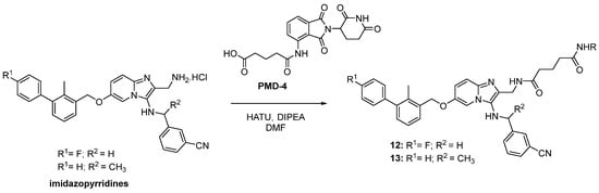 The biphenyl chimeras 11 and 12 containing imidazopyridines were prepared by means of the HATU coupling between the carboxylic acid-derived pomalidomide with amine PD-L1 inhibitors. The amine-barring PD-L1 inhibitors were obtained through the Groebke–Blackburn–Bienayme reaction as previously reported (Scheme 3) [24].