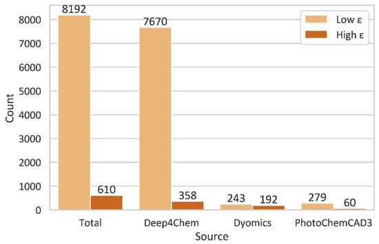 Figure 1. Dataset breakdown for molecules with high and low extinction coefficients ε. The threshold is 150,000 M−1cm−1.