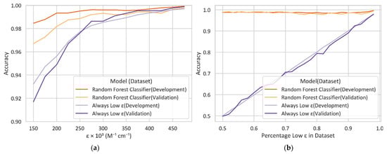 Figure 2. Accuracy comparison between Random Forest Classifier and a model that always classifies a molecule with low ε no matter what structural features the molecule has. They both were developed and validated with (a) all and (b) partial data.