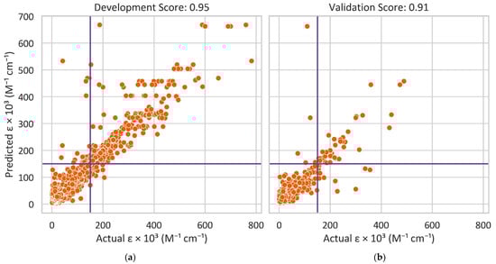 Figure 3. The extinction coefficients ε of the (a) development and (b) validation datasets predicted by a Random Forest Regressor in comparison with actual values from literature.