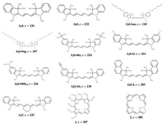 To identify dyes with high ε (which is indicative of high μ ) the optimized Regressor model was further applied to a dataset containing around 18,000 potential dye candidates, including the commercially available cyanine dyes such as Cy3, Cy5, Cy5.5, and Cy7, shown in Figure 4. These dyes are known to exhibit large ε (and thus, large μ and strong dye coupling) [86], and are of interest to our research group and collaborators [27]. Four modified Cy5 dyes with hydrophobic substituents were also considered in this study. These dyes, labeled as Cy5-Cl, Cy5-Peg, Cy5-hex, and Cy5-tBu, are also shown in Figure 4 and are hypothesized to exhibit stronger dye coupling due to being more hydrophobic compared to Cy5, which may result in shorter inter-dye distances [87]. Two other modified dyes, Cy5-CN and Cy5-NMe2, were considered since CN and NMe2 were shown to have a large effect on excess dipole moments (the difference in the dipole moments of the ground and excited states) of similar dyes [45,46]. The rest of the dataset consisted of dyes obtained from PubChem [88], including dyes with similar structures to cyanine, porphyrin, and methyl violet molecules. Those three classes of dyes were chosen for their prominent π -conjugation [89,90,91], absorption in the visible light range [90,92,93], and excitonic applications [90,92,94,95,96].