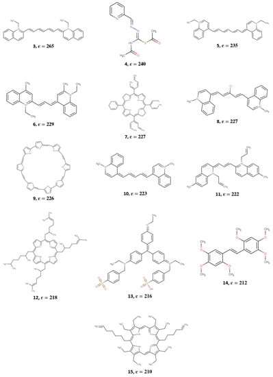 The Regressor model was also applied to the dataset obtained from PubChem [88] to identify additional potential dye candidates. The top 100 dyes that were predicted to have ε above 150,000 M−1cm−1 were then screened using DFT and TD-DFT to determine their μ values by calculating vertical excited state transitions to the lowest 30 excited states. Of the 100 dye candidates, the 15 dye candidates with desirable properties, such as absorption wavelength in the visible region, large π -conjugated networks, and μ comparable to that of Cy5 (within 50%), are shown in Figure 5 and are labeled 1–15. Their corresponding ML-predicted ε and TD-DFT-calculated μ values are listed in Table 1.