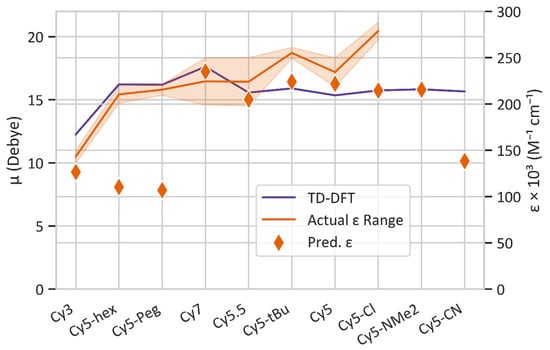 Figure 5. ML-predicted extinction coefficients ε and TD-DFT-calculated transition dipole moments μ of 10 dye candidates of interest in comparison with the experimentally available ε values [29,87,97,98,99,100].