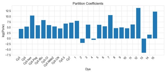 To approximate the relative hydrophobicity of the dyes, the partitioning coefficient between n-octanol and water, log ( P o / w ) , was calculated according to [69,70]