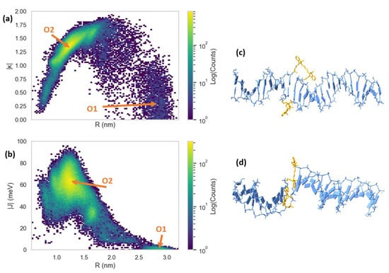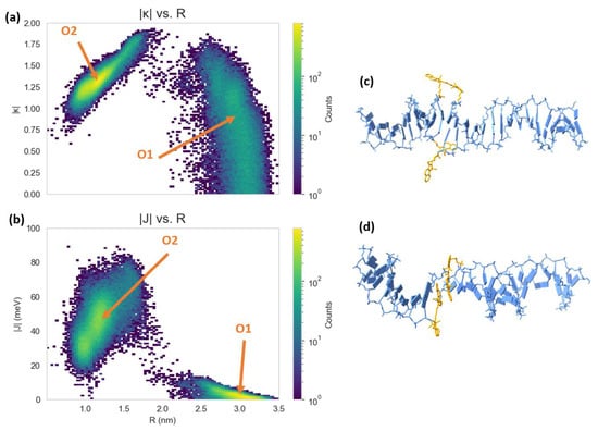 Figure 9. Heatmap plots of (a) orientation factor ( ( | κ | ) ), and (b) exciton exchange energy ( | J | ) versus dye center-to-center distances ( R ) for the 900 ns Cy5.5 dimer–DNA duplex MD trajectory. Snapshots of the structural configurations of (c) pre-intercalation (corresponding to region O1) and (d) post-intercalation (corresponding to region O2) that represent peaks in the | J | vs. R heatmap. The DNA duplex is shown in blue and the Cy5.5 dyes and linkers are shown in orange.