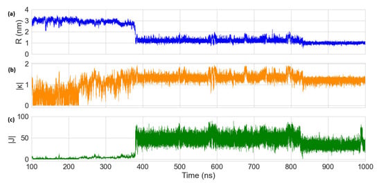 The MD results for the Cy5 dimer attached to a DNA duplex are presented in Figure 7 and Figure 8. Figure 7a shows a heatmap plot of | κ | versus R , and Figure 7b shows a heatmap plot of | J | versus R for the 900 ns of data collection. Based on the | κ | values shown in Figure 7a, there are two distinct dimer orientations, labeled “O1” and “O2”. The approximate | J | regions corresponding to O1 and O2 are also shown in Figure 7b. As shown in Figure 7c, O1 corresponds to where the dyes are located outside of the duplex (i.e., non-intercalated). This orientation has a | κ | value ranging approximately from 0–1 (oblique and H-like aggregate) and an R of approximately 2.5–3.0 nm, which results in a relatively low | J | of less than 20 meV. Examining Figure 8, a shift in the orientation of the dyes occurs after around 150 ns of simulation, where the dyes re-orient and intercalate into the base-stack region of the DNA. This change in orientation results in a mostly head-to-tail (J-like) configuration with some obliqueness, corresponding to a | κ | of about 1.25–1.5 and an R of about 0.9–1.5 nm, as indicated by O2 and represented in Figure 7d. This more closely spaced orientation results in a larger | J | of roughly 40–80 meV. Since |J| was relatively stable after 200 ns, all dimer orientations beyond that time were averaged, yielding | κ | = 1.35   ±   0.22 and R   = 1.26   ±   0.21 nm. Thus, averaging | J |   over this period of time results in | J | = 58.28 ± 12.74 meV. The post-200 ns average values of R and | J | agree well with the experimentally derived values of R   = 1.32 nm and | J | = 48 meV, as obtained by Huff et al. [29]. Furthermore, they determined the dimer to have a similar orientation, with a red-shift in the main absorption peak observed for the dimer relative to the monomer, indicating a mostly J-like orientation [29]. The ~ 10 meV larger | J | value obtained from MD might be caused by a slight overestimation of μ Cy 5 using TD-DFT, which is shown to be ~ 2 D larger than the μ Cy 5 obtained from experimental measurements [29,46].