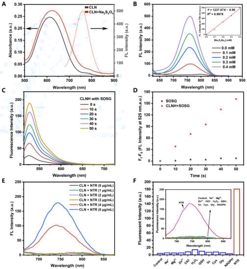 (A) Absorption (solid lines) and fluorescence spectra (dotted lines) of CLN (10 μM) without (black) or with (red) Na2S2O4 (0.4 mM). (B) Fluorescence spectra of CLN (10 μM) in different concentrations of Na2S2O4 (0–0.4 mM). Inset: The linear correlation of the fluorescence intensities at 758 nm with the concentrations of Na2S2O4. (C) Fluorescence spectra of SOSG (2 μM) in the CLN solution (10 μM) after NIR laser irradiation (660 nm, 0.2 W/cm2) at different time points (0, 10, 20, 30, 40, and 50 s). (D) Changes in the fluorescence intensities at 525 nm vs. the irradiation time. (E) Changes in the fluorescence spectra of CLN (10 μM) response to different NTR concentrations (0–5 µg/mL) with NADPH (500 μM) in PBS (10 mM, pH 7.4) containing 10% EtOH at 37 °C after 30 min of incubation. (F) Selectivities of the fluorescence responses of CLN (10 μM) to different species: NaCl (10 mM), MgCl2 (10 mM), ZnSO4 (10 mM), ClO− (10 mM), H2O2 (10 mM), GSH (1 mM), Vc (1 mM), Cys (1 mM), Gly (1 mM), NADPH (500 μM), and NTR (5 μg/mL in the presence of NADPH (500 μM)) in PBS buffer at 37 °C in the presence of CLN (10 μM). Control: CLN (10 μM). All the samples were tested after 30 min of incubation.