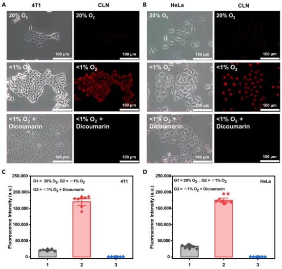 (A,B) Fluorescence imaging and (C,D) relative cell fluorescence intensities of CLN (5 μM) in the 4T1 and HeLa cells under normoxic (20% O2) and hypoxic (<1% O2) conditions without or with the NTR inhibitor (dicoumarin (0.5 mM)), respectively. These cells were incubated for 3 h with 5 µM CLN, after which they were kept under normoxic (20% O2) and hypoxic conditions (<1% O2) for 8 h, followed by the incubation of the hypoxic group with 0.5 mM dicoumarin for 1 h before hypoxia. The fluorescence imaging of these cells was performed with an Olympus IX73 (scale bar = 100 μm).