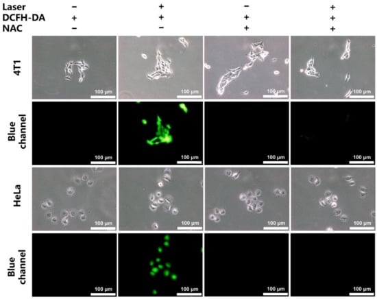 The intracellular generation of ROS in the 4T1 and HeLa cells was further investigated employing DCFH-DA as the intracellular ROS probe. After the laser irradiation without any other treatment, the CLN-treated cells displayed significant green fluorescence signals, indicating that CLN generated ROS in the cells (Figure 4). After adding N-acetyl-L-cysteine, the ROS scavenger, the green fluorescent signal disappeared.