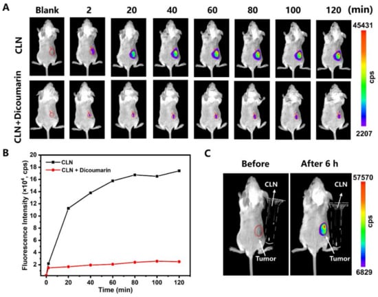 (A) Fluorescence imaging of the 4T1 tumor-bearing BALB/c mice at 2, 20, 40, 60, 80, 100, and 120 min after the intratumor injections of CLN (2.5 μmol/kg) and CLN (2.5 μmol/kg) + dicoumarin (0.5 mM). (B) Fluorescence intensities of the “CLN” and “CLN + Dicoumarin” groups at the tumor site vs. time (n = 3). (C) Fluorescence imaging of the 4T1 tumor-bearing BALB/c mice before and after 6 h of CLN (2.5 μmol/kg) injection and CLN solution in the Eppendorf tubes (the dotted outline; 500 μM, Tris buffer, 10 mM, pH = 7.4, containing 10% DMSO).