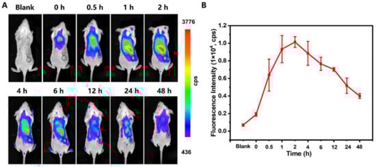 (A) In vivo fluorescence imaging of the 4T1 tumor-bearing mice at 0, 0.5, 1, 2, 4, 6, 12, 24, and 48 h after intravenous injection of CLN (2.5 μmol/kg). The black cycles indicate the tumor sites. (B) Fluorescence intensities of the tumor sites vs. times (n = 3).