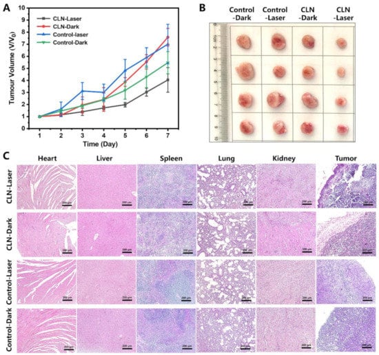 Twenty tumor-bearing BALB/c mice were randomly divided into four groups: “Control-laser group”, “Control-dark group”, “CLN-laser group”, and “CLN-dark group”. The control group was injected with 100 μL saline via tail-vein injection, the CLN group was injected with CLN at a dose of 2.5 μmol/kg, and the “CLN-laser group” was irradiated with a 660 nm (0.2 W/cm2) laser for 15 min after treated with CLN via tail-vein injection for 2 h. The study period was 7 days, and the CLN was injected once a day at an interval, three times within 7 days, and the laser groups were irradiated for 15 min each day. The mice were weighed, and the tumor volume was measured and recorded daily. The tumor volume was measured by vernier calipers and calculated according to the following Formula (6):