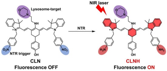 Targeting and NIR-florescence-activation mechanisms of the CLN. The cyanine fluorophore is marked in bright red in the structure of CLNH; the lysosome-targeted morpholine group is labeled in purple; the nitrobenzene groups as an NTR-response unit are marked in blue in the structure of CLN, which are reduced to amino groups after being triggered by NTR, marked in dark red in the structure of CLNH.
