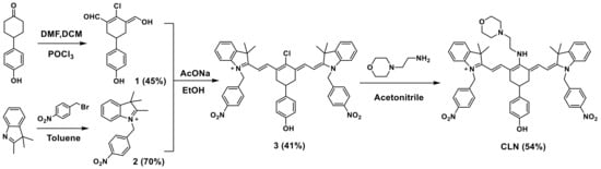 Three factors were considered when designing lysosome-targeted NTR-stimulated NIR PS with fluorescence responses. First, the absorption and fluorescence emission wavelengths of the fluorescent unit of PS were preferably in the NIR region to increase the light-penetration depth, reduce the background, and improve the imaging quality and PDT effect []. Second, morpholine, which is known to facilitate the localization of PS in the cellular lysosome, as well as enhance the cell-killing effect of PS, was selected as the lysosome-targeting group []. Third, nitrobenzene, which has exhibited high sensitivity to NTR in vitro and in vivo, was selected as the recognition site for NTR. Additionally, the fluorescence of PS was quenched via the PET effect and restored after responding to NTR []. Here, we prepared our novel cyanine-based lysosomal PS (CLN) by introducing the morpholine and nitrobenzene groups, which could selectively locate lysosomes, demonstrate a specific response to NTR, and facilitate NIR fluorescence imaging and PDT (Scheme 1). CLN was obtained by a four-step synthesis (Scheme 2). Further, the structures of the intermediates and CLN were characterized by nuclear magnetic resonance (NMR) spectroscopy and high-resolution mass spectrometry (HRMS) (Figures S1–S8).