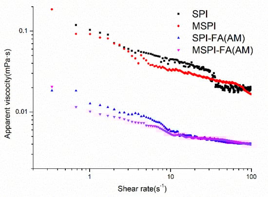 The emulsion stabilized by soy protein is a non-Newtonian fluid emulsion with shear thinning behavior, and the apparent viscosity decreases with increasing shear rate [28]. The apparent viscosity curves of different modified soy protein emulsions were analyzed by the Ostwald–de Waele empirical formula, and the limiting high-shear viscosity (η∞), the consistency coefficient (K), and flow characteristic index (n) were fitted as shown in Table 2. In general, the greater the K value, the greater the viscosity of the emulsion. The closer the n value is to 0, the more obvious the shear thinning. The closer the n value is to 1, the lower the dependence of the emulsion viscosity on the shear rate [13]. After modification by microwaves, the viscosity of the emulsion decreased, and the n value increased from 0.616 ± 0.010 to 0.754 ± 0.004, which showed that the dependence of the emulsion viscosity on the shear rate decreased, possibly due to the change in the conformation of soy protein modified by microwaves, the formation of emulsions with higher zeta-potential absolute values, the decrease in aggregation between emulsion droplets, and the decrease in shear thinning behavior of emulsions [29]. After covalent binding with polyphenol, the viscosity coefficient K of the SPI-FA(AM) emulsion decreased, and the n value increased from 0.616 ± 0.010 to 0.768 ± 0.004, which showed that covalent binding with polyphenol could decrease the viscosity of the emulsion stabilized by protein. The apparent viscosity was reduced by the shear rate, which can be attributed to the decrease in the average particle size of the emulsion stabilized by the polyphenol-protein covalent complex, the decrease in the flow resistance, the greater order under shear conditions, the decrease in the viscosity of the emulsion, and the lower shear-thinning behavior of the emulsion [30]. After the soy protein was covalently modified by microwave-alkaline polyphenols, the viscosity of the emulsion was further reduced, and the n value was higher, which indicated that droplet aggregation was less and that the shear thinning behavior was weaker (Figure 1).