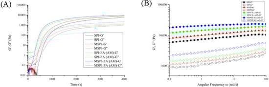 Time sweep (A) and frequency sweep (B) of emulsion gels induced by different modified soybean protein isolates.